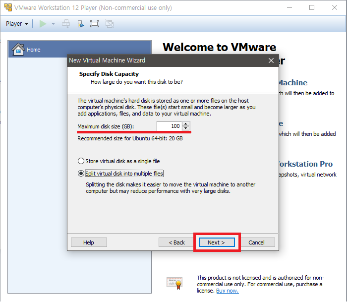 8. 해당 가상머신에 할당할 디스크 용량을 설정해줍니다.