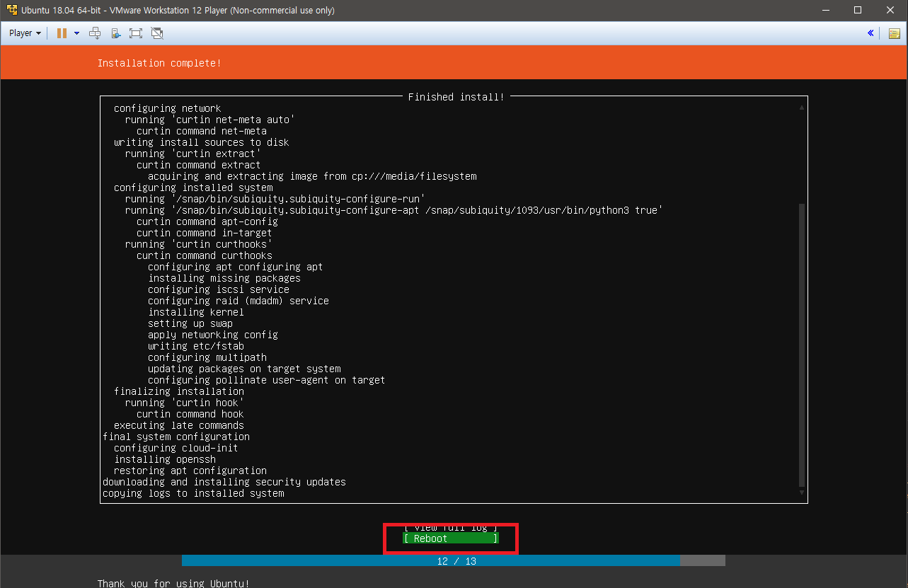 19. 이 화면에서 조금 기다리시면 아래 Reboot 버튼이 등장하며 설치가 종료됩니다.