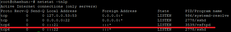 다음 사진과 같이 21번 포트를 통해 Program name이 vsftpd로 실행되고 있는것을 확인할 수 있습니다.