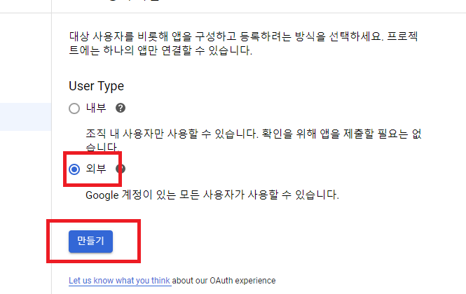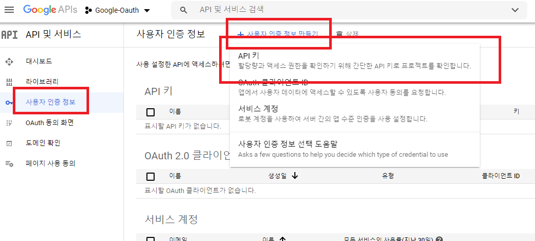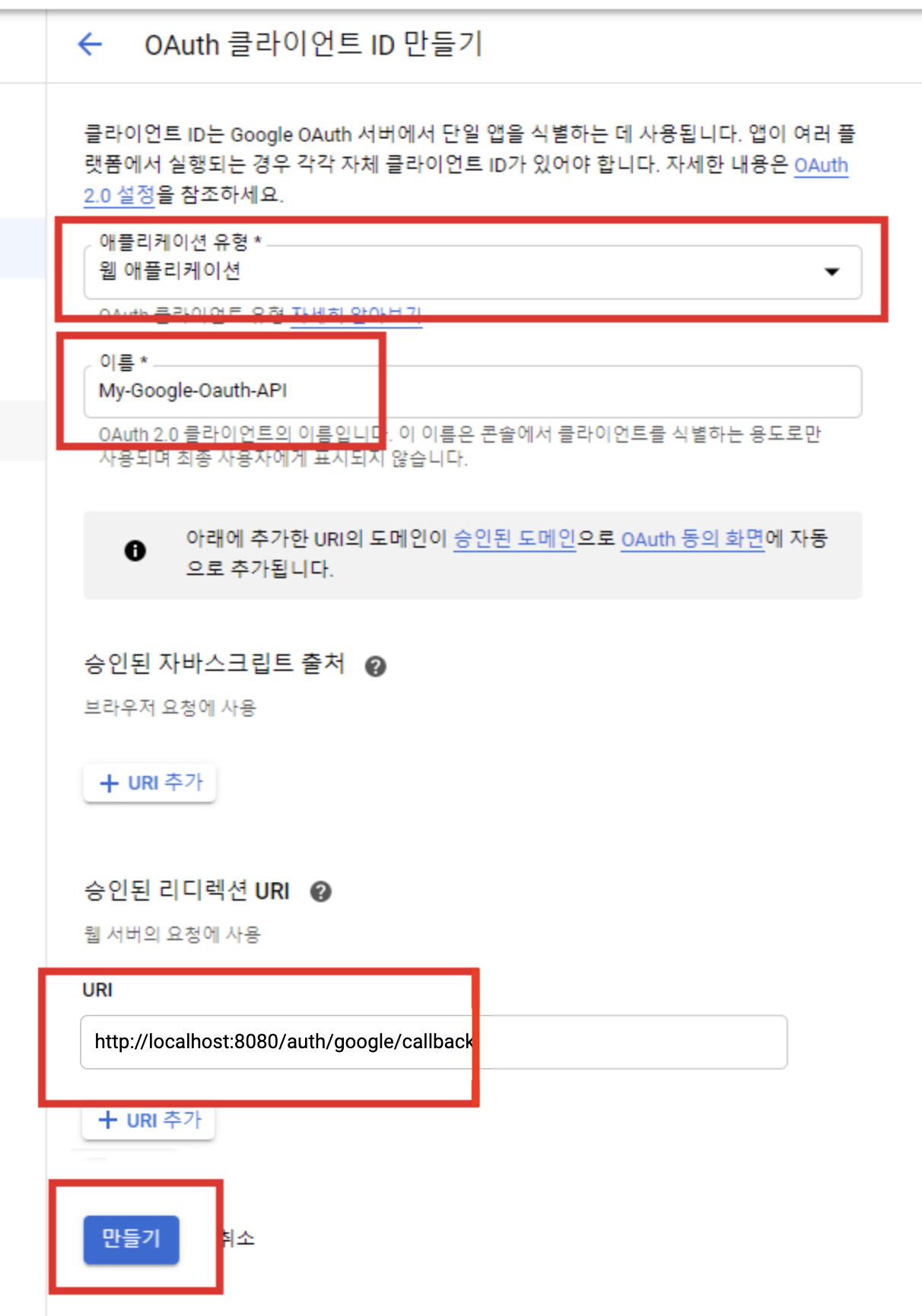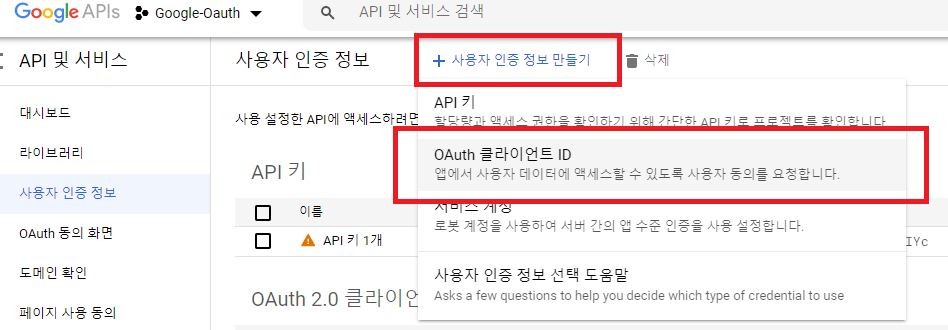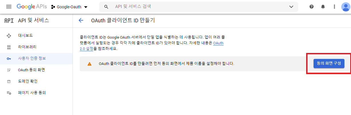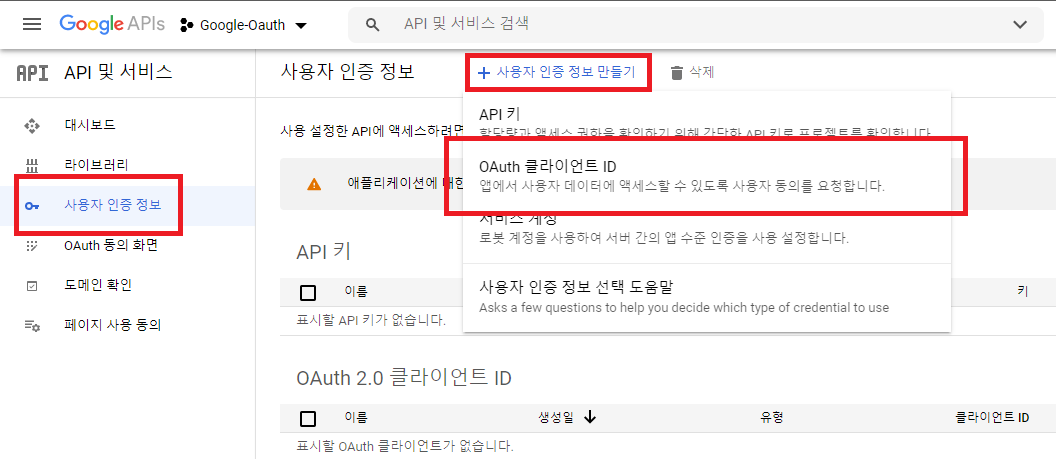 - OAuth 클라이언트 ID 생성(사용자 인증 정보 생성)