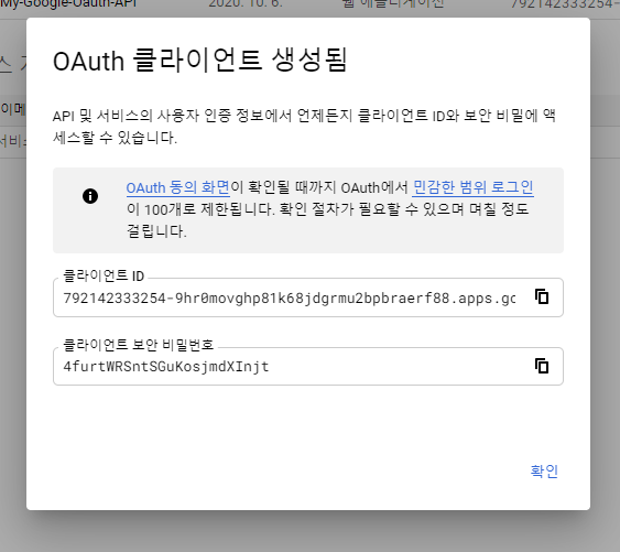 여기서 발급된 클라이언트 ID와 비밀번호가 Google Social Login을 구현하는데 사용될 내 프로젝트 인증정보입니다.