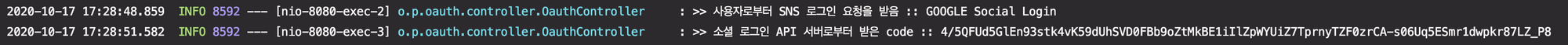 callback 메소드 추가 이후 다시 앞장에서 테스트했던 URL인 http://localhost:8080/auth/google 로 요청을 해보면 로그상에 아래와 같이 코드를 성공적으로 받을수 있음을 확인할 수 있습니다.