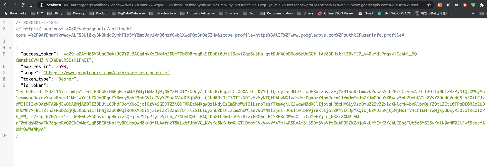 위와 같이 Json 형태의 데이터가 등장하면 성공적으로 Access Token 및 Refresh Token이 발급된것입니다.