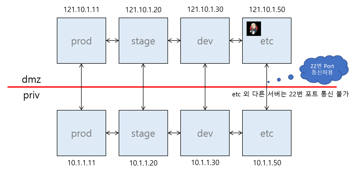 그런데 Jenkins가 현재 구성상으로 Direct로 모든 서버에 SSH 접근이 이루어지지 못하는 상황이라 Bridge나 Proxy와 같은 설정이 필요로 하다고 생각했습니다.