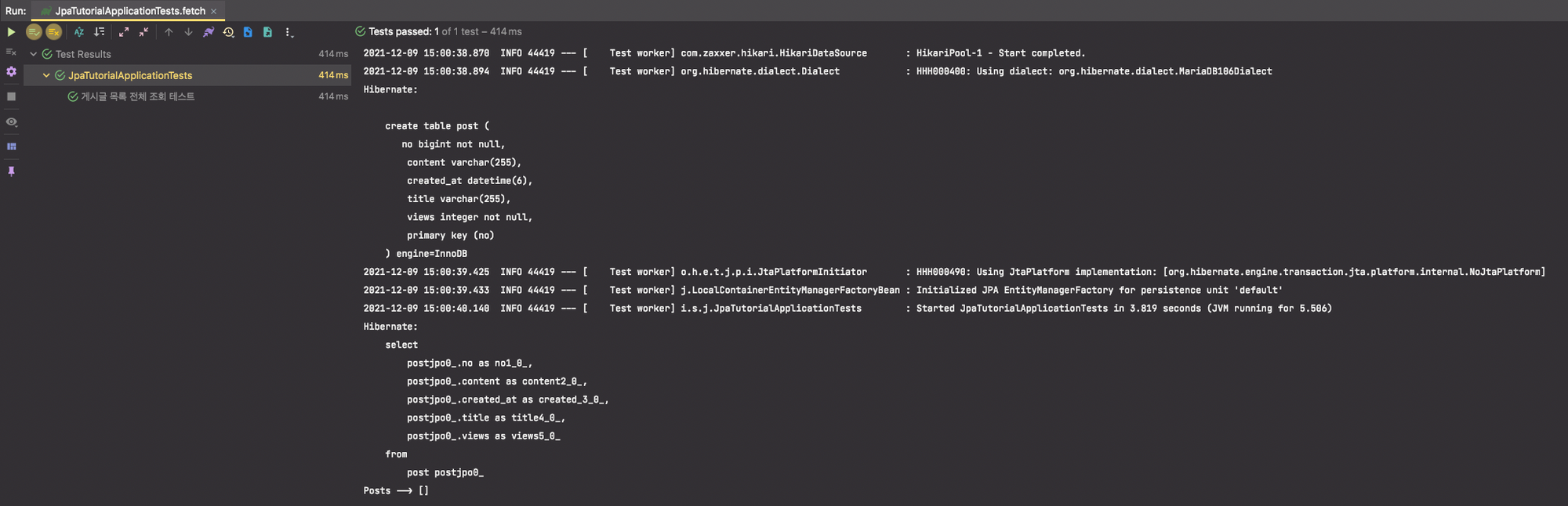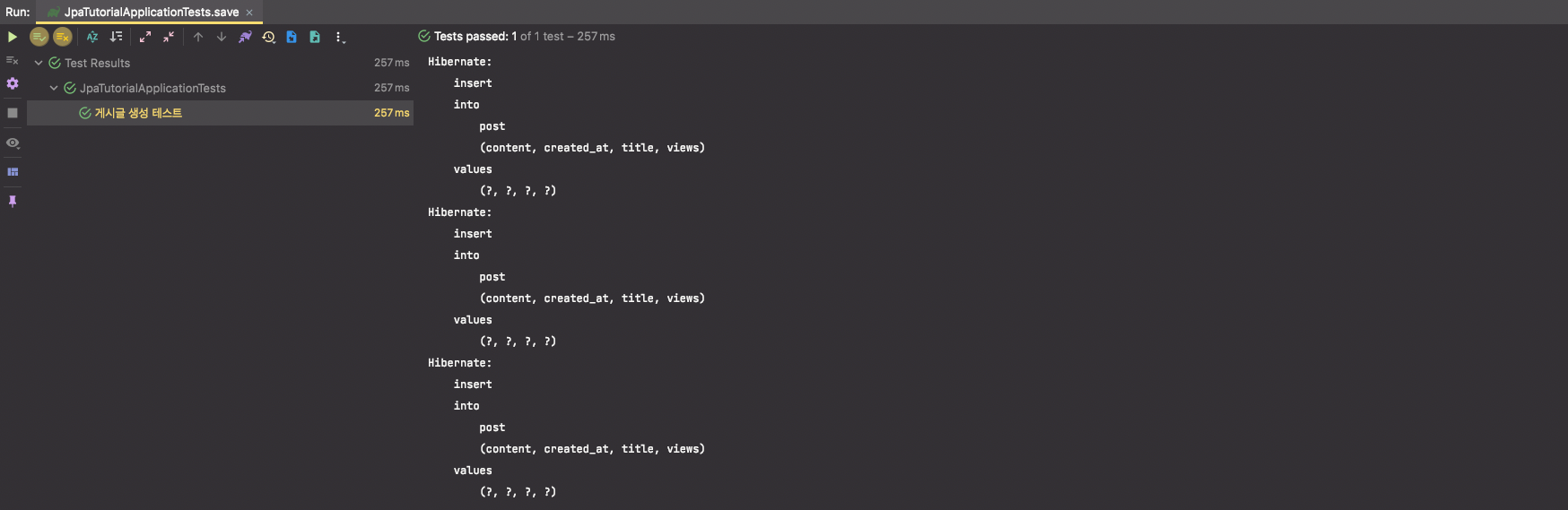 임의의 임시 Post 객체들을 생성하여 save 로직을 수행하면 아래와 같이 insert SQL문이 수행되면서 데이터베이스에 정상적으로 생성됨을 확인할 수 있습니다.