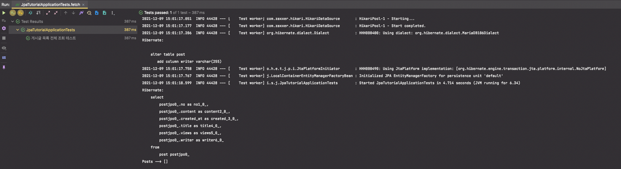임의의 임시 Post 객체들을 생성하여 save 로직을 수행하면 아래와 같이 insert SQL문이 수행되면서 데이터베이스에 정상적으로 생성됨을 확인할 수 있습니다.