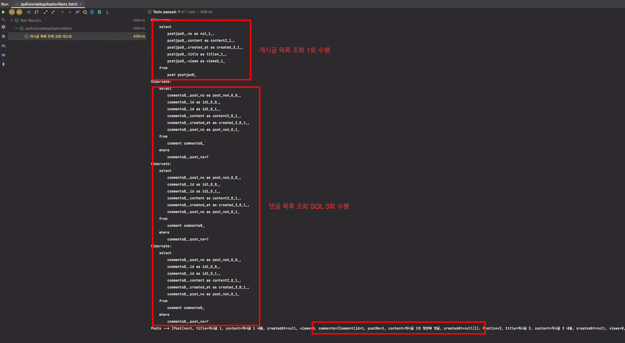 그리고 다시 전체 게시글을 조회하는 테스트 로직을 수행해보면 성공적으로 자식 Entity(댓글) 목록이 조회됩니다.