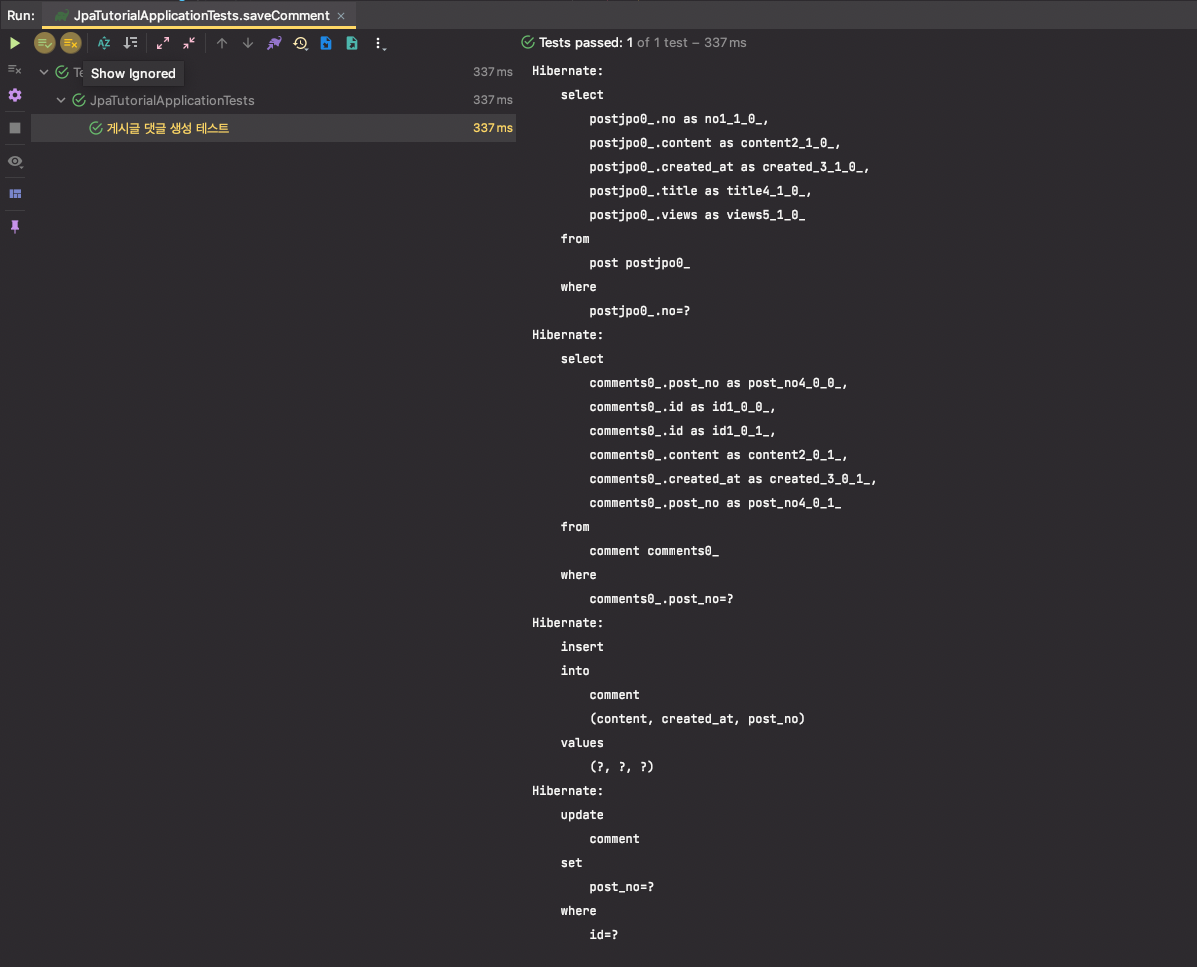 여기서 별도로 Repository 클래스에서 Insert가 이루어지는 save 메소드를 호출하지 않고 Entity의 상태를 변경해주는 addComment 함수를 호출하게 되면 Spring Data JPA의 Dirty Checking 변경 감지로 인해 자동으로 SQL문이 수행됩니다.