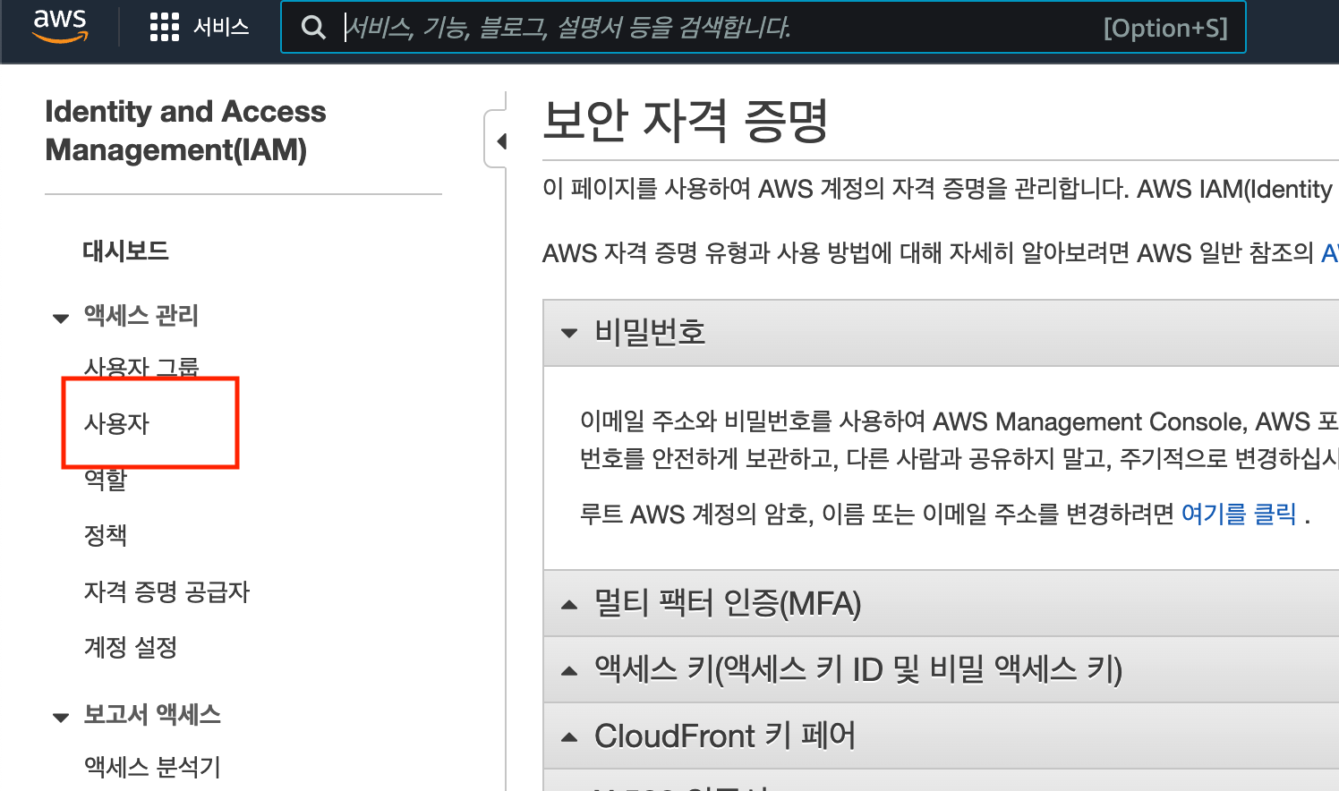 보안 자격 증명(IAM) 설정(Access Key, Secret Key 발급)