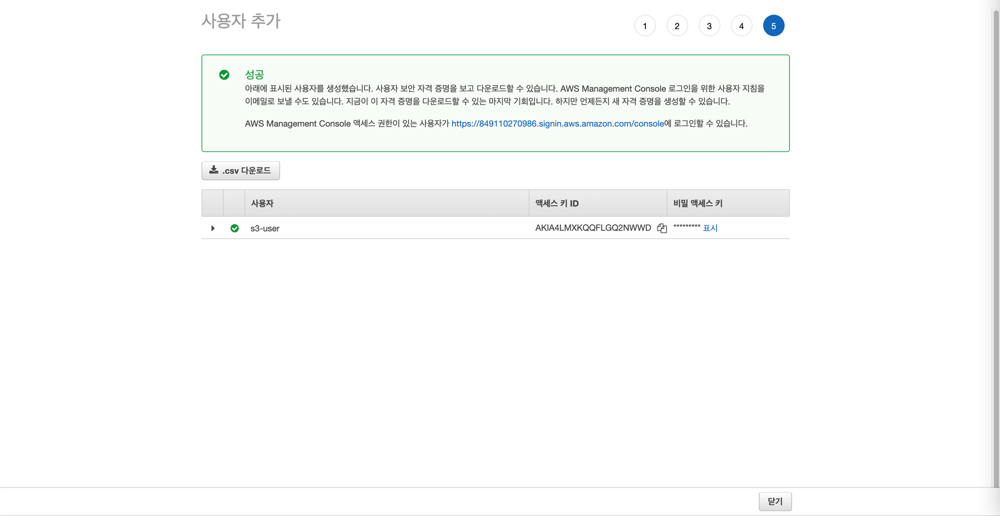 마지막 페이지에서 나타나는 액세스 키 ID와 비밀 액세스 키를 어딘가에 잘 저장해두도록 하고 추후에 어플리케이션에서 사용할 값들입니다.